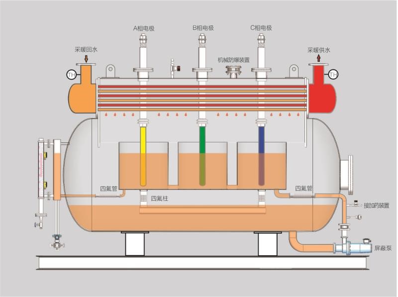从图中可以看到◈ღ◈★,锅炉产生的蒸汽通过内置不锈钢换热器将二次侧回水加热至额定温度◈ღ◈★,蒸汽经换热后成冷凝水直接回到外锅桶◈ღ◈★,与炉水混合后◈ღ◈★,经内循环泵到内锅桶◈ღ◈★,经电极加热后再次形成蒸汽……